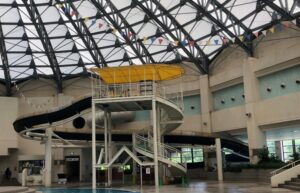 広いセンタープールとウォータースライダーがあります。